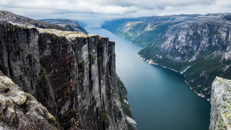 Trolltunga hangt maar liefst 700 meter boven het Ringedalsmeer en het uitzicht vanaf deze uitstekende rots is werkelijk adembenemend – een van de mooiste panorama’s die je kunt vinden langs de Noorse fjorden. De route is uitdagend met steile stukken en rotsachtig terrein, dus een goede conditie en de juiste voorbereiding zijn essentieel. Daarnaast is er weinig beschutting tegen wind en regen, wat het belang van een goede uitrusting benadrukt.
